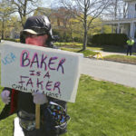 The protesters, including supporters of President Donald Trump, held signs reading “Tyranny is not Leadership,” “Governor Baker End Lockdown Hoax,” and “End Shutdown” and waved American flags and flags bearing Trump’s name.