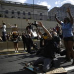 A few hundred protesters were forced down Benjamin Franklin Parkway toward City Hall after the interstate demonstration. Many went to the Police Department headquarters known as the Round House on Arch Street, where a line of National Guard members and police officers stood watch on the stairs.