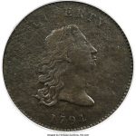 Known as a pattern, the front features the flowing hair portrait of Liberty and the date 1794, while the reverse side shows a small eagle on a rock within a wreath. Similar starless examples are part of the Smithsonian Institution’s National Numismatic Collection.