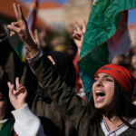 Protesters from the Kurdish community chant slogans during a protest to condemn Syrian government military operations against the Syrian Democratic Forces (SDF) in Syria, outside the ESCWA headquarters in Beirut, Lebanon, Tuesday. (AP)