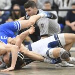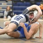 Norwin’s Landon Sidun pins Trinity’s Gavin Bricker in the 121-pound bout during the 3A WPIAL team wrestling quarter finals, Wednesday, at Norwin High School. (Chaz Palla | TribLive)