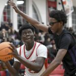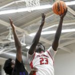 Sewickley Academy’s Mamadou Kane drives to the basket against Obama Academy’s Zion Conner on Wednesday in Sewickley. (Christopher Horner | TribLive)