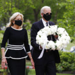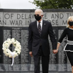 Biden and his wife, Jill, laid a wreath of white flowers tied with a white bow, and bowed their heads in silence at the park. He saluted. “Never forget the sacrifices that these men and women made,” he said after. “Never, ever, forget.”