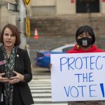 Dozens of protesters gathered just outside the Capitol on Monday in opposition to the bill, chanting “say no to voter suppression” and “protect the vote.”