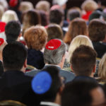 Before Trump’s appearance, people assembled for the event carried signs with “We are Jews for Trump” and “Trump” written in Hebrew. Dozens of men and several women wore red yarmulkes with “Trump” in white that were distributed at the event.
