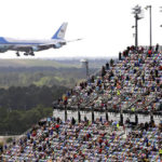 Given the honor of grand marshal for the race, Trump gave thousands of fans a flyover of Air Force One and then rode onto the track in the presidential motorcade as the audience roared with delight. The motorcade took roughly a quarter lap before pulling aside in an infield staging area.