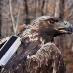 Unlike bald eagles, golden eagles prefer remote forests and mountains. Miller said she and Lanzone rarely see the birds unless they’re in a blind at a repeatedly visited camera trap. The scientists set up a box-shaped net launcher near the bait to catch birds for tagging while they wait in the blind where they hid before dawn.