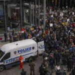 About 300 demonstrators protested at a Tesla dealership in New York City on Saturday. Police said nine people were taken into custody but did not elaborate on the charges they faced.