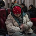 Grasping her fluffy white dog, an elderly woman who made it to Romania collapsed in exhaustion in a ballroom converted into a refugee shelter.