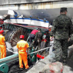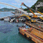 National Fire Agency spokesperson Su Hong-wei said the oil tanker truck’s fall smashed three fishing boats. It also set off a fire on the truck, but it did not spread beyond the vehicle.