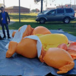 Jim Girvan, the organizer of a group that “adopts” out the Trump balloons for protests, said a man charged the balloon with a knife and cut an 8-foot-long (2.4-meter-long) gash in the back.