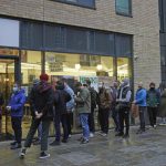Hundreds of people lined up Saturday in the English city of Bristol to get the latest work by elusive street artist Banksy — a T-shirt created to help four defendants charged over the toppling of a local statue of a slave trader.