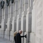 The first lady laid a bouquet of flowers at the base of the memorial below the New Jersey pillar and softly touched a wall, where she and the president spent a moment. The bouquet was in honor of her father, Donald Jacobs, who served as a U.S. Navy signalman in the war, the White House said.
