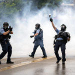 They eventually marched about 2 1/2 miles to a city police precinct, with some protesters damaging windows, a squad car and spraying graffiti on the building. A line of police in riot gear eventually confronted the protesters, firing tear gas.