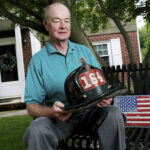 Wearing his old firefighter helmet from Ladder Company 164 in Queens, the Long Island resident stood with President George W. Bush as he delivered a rousing speech to weary responders three days after hijackers crashed airplanes into the twin towers of the old World Trade Center, killing 2,753 people.