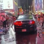 The New York Police Department says it is trying to find a car that drove through a group of Black Lives Matter protesters blocking a street in Times Square.