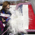 Caroline Kennedy smashed a bottle across the USS John Kennedy carrier’s hull Saturday at the shipyard in Newport News, Virginia. She is the sponsor of her father’s namesake ship.
