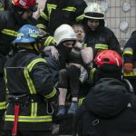 In Dnipro, workers used a crane as they tried to rescue people trapped on upper floors of the apartment tower where about 1,700 were living. Some residents signaled for help with lights on their mobile phones.