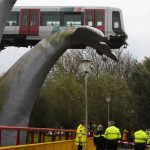 A Dutch metro train, which was riding without any passengers, has been saved from disaster after it smashed through a safety barrier but was prevented from plummeting into water by a sculpture of a whale tail pic.twitter.com/qdVsWQB62S