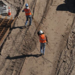 Workers in fluorescent smocks can be seen digging trenches, pouring concrete and erecting rust-colored slabs of 18-foot-high metal to replace layers of barbed wire-topped fencing along the mud-colored Rio Grande, which is usually little more than a trickle.