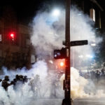 Demonstrators crowded in front of the U.S. federal courthouse and the city’s Justice Center late Monday night, before authorities cleared them out as the loud sound and light of flash bang grenades filled the sky.