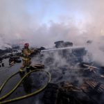 Some nearby residents left their homes, but firefighters pouring streams of water prevented the flames from spreading to residences. It took several hours to control the flames.