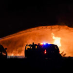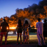 Firefighters believe the blaze started when a power line fell about midnight Tuesday near an area where plastic rolls were being stored, causing them to catch fire, Assistant Fire Chief Bill Murphy said. “These are rolls of plastic sheeting, huge rolls, and they’re stacked sometimes eight feet high. Plastic is hard to put out and it’s just gonna burn,” he said.