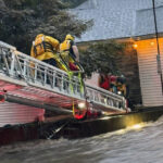 In Oxford, rushing waters surrounded the Brookside Inn, trapping 18 people. Firefighters stretched a long ladder like a bridge across the floodwaters to reach them as cars and other large debris carried by the torrent smashed into the building, said Jeremy Rodorigo, a firefighter from neighboring Beacon Falls. One by one, people crawled across the ladder to safety.