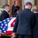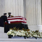 Ginsburg has lain in repose for two days at the Supreme Court, where thousands of people paid their respects, including President Donald Trump and first lady Melania Trump on Thursday. Spectators booed and chanted “vote him out” as the president, who wore a mask, stood silently near Ginsburg’s casket at the top of the court’s front steps.