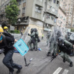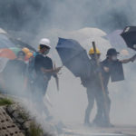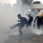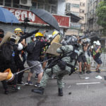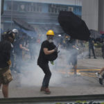 By nightfall, protesters and police were once again facing off in the streets, as they’ve done previously during the summer-long pro-democracy protests in the Chinese territory. Demonstrators threw objects and ducked behind makeshift shields, and police officers shot plumes of tear gas into the air.