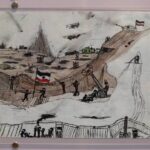 His pictures from that time are in blue ballpoint pen on pieces of paper torn out of notebooks — that’s all Kostenko had. One of them shows the tiny basement where he and his family sheltered from the Russian shells before finally managing to flee the city.