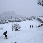 Some children skipped online classes Tuesday to play in the snow. Adults also went out to play, with some digging out skis to use on the capital’s hilly slopes. One man skied along Pnyx hill in central Athens, near the Acropolis.