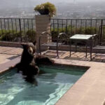 After a short dip, the bear climbed over a wall and headed to a tree behind the home, police said in a statement Friday.
