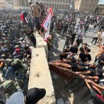 Meanwhile, al-Sadr supporters — many had come not just from Baghdad but other provinces as well in order to stage the sit-in — continued to throng the parliament building, occupying the parliament floor and raising the Iraqi flag and portraits of al-Sadr. They chanted against the intrusion of foreign states, a veiled reference to Iran.