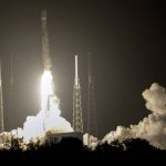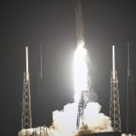 Eight minutes after launch, the recycled first-stage booster landed back at Cape Canaveral under a near full moon, the double sonic booms echoing through the night.