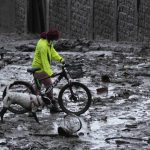 Smaller waves of muddy water continued pouring down the ravine Tuesday morning past weary neighbors trying to move stones, tree trunks and debris. An overturned taxi and other vehicles were partly buried in mud on a sports field.