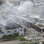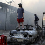 There was no sign of police at the destroyed shopping center, though a couple dozen were outside the precinct house. One man standing outside the building was using a bullhorn to shout. “I can’t breathe, I can’t breathe. Mama, I can’t breathe,” repeating some of Floyd’s pleas for relief.