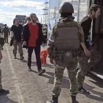 Footage shot by The Associated Press shows the convoy was escorted by military vehicles bearing the pro-Kremlin “Z” sign, as Soviet flags fluttered from poles along the road. About two dozen Ukrainian fighters were seen waiting in one of the buses.