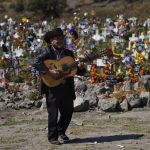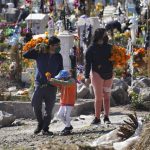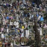 “These days are not sad here; they are a way to remember our dead with great happiness,” said Otilia Ochoa, a homemaker who came along with dozens of others to take pictures of the flower-decked offerings near the coronavirus memorial. “What is good is to recover this liberty, this contact we had lost” during the pandemic, Ochoa said.