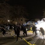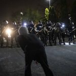 About 90 minutes after the curfew deadline, police began firing gas canisters and flash-bang grenades, sending clouds wafting over the crowd and chasing some away. Some protesters picked up smoke canisters and threw them back toward police. Others shot fireworks toward police lines. A long line of police in riot gear, rhythmically pushing their clubs in front of them, began slowly forcing back the remaining crowds.