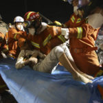 Video released by rescuers showed the two being pulled from the debris of the hotel that collapsed on Saturday. The woman and boy were discovered late Monday night and they were freed around midnight after three hours of painstaking digging.