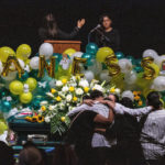 In a private moment just before entering the school’s auditorium— where flowers in green and yellow hues, balloons, religious images and pictures of Guillen adorned the stage— family and friends walked behind the casket, accompanying Guillen on a last lap around the field she frequented as a teenager. Guillen’s mother and grandmother grasped each other as they prayed over the casket through sobs.