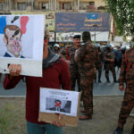 On Monday, dozens of protesters gathered in front of the French embassy in central Baghdad. One held up a caricature of the French president with footprints stamped over his face.