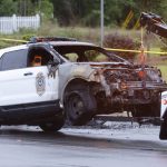 Although the chief didn’t elaborate on the vehicles burned, news photographs showed a police vehicle with what appeared to be a blackened and heavily damaged engine bay being towed away.