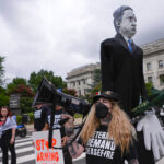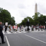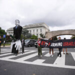Among the protesters was a group of artists from Baltimore displaying a massive papier-mâché sculpture meant to depict President Joe Biden with blood on his hands and devil horns. They said the sculpture took months to construct and is meant to represent Biden’s unwillingness to stand up to Israel.