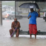 Garbage containers tilted on their sides and pieces of wood floated down rain-swollen streets in New Orleans. Water was up to the doors of many cars during the morning rush hour.