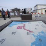 Visitors walk by a map Wednesday of two Koreas showing North Korea’s capital Pyongyang and South Korea’s capital Seoul at the Imjingak Pavilion in Paju, near the border with North Korea and South Korea.