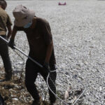 Fishing trawlers have been chartered by the regional authorities, along with earthmovers, to scoop the dead fish out of the sea and load them onto trucks bound for an incinerator.