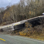 NRK posted a video of the train which had left its mountainside tracks, crashing through trees and down onto the road, which was closed to traffic in the wake of the derailment.