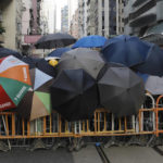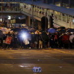 They stopped about two blocks short of the office and used orange and white construction barricades to build a wall spanning a major road. They massed behind the barriers as night fell, with umbrellas pointed forward to shield their identities and ward off any police move to clear them.